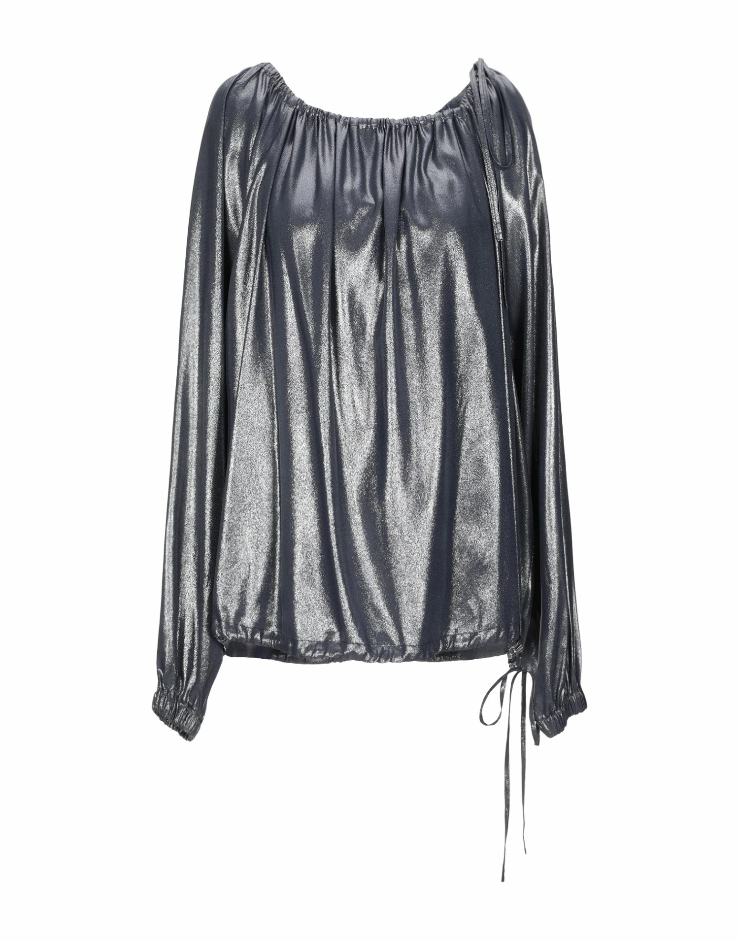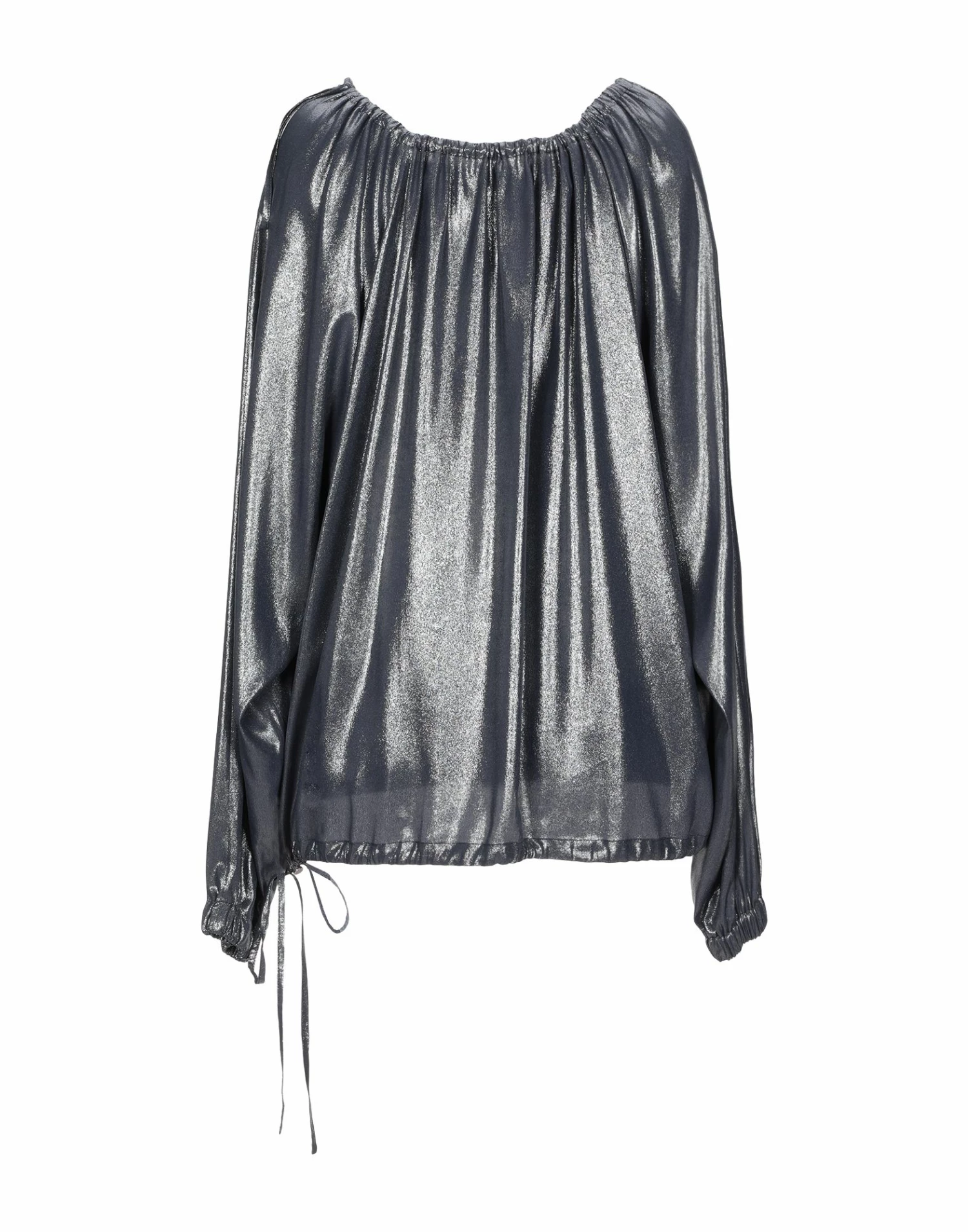 crepe, frills, laces, basic solid color, long sleeves, wide neckline, no pockets, drawstring hem, lamé, small sized