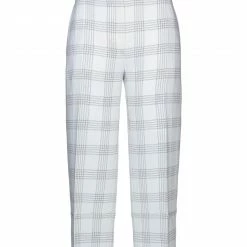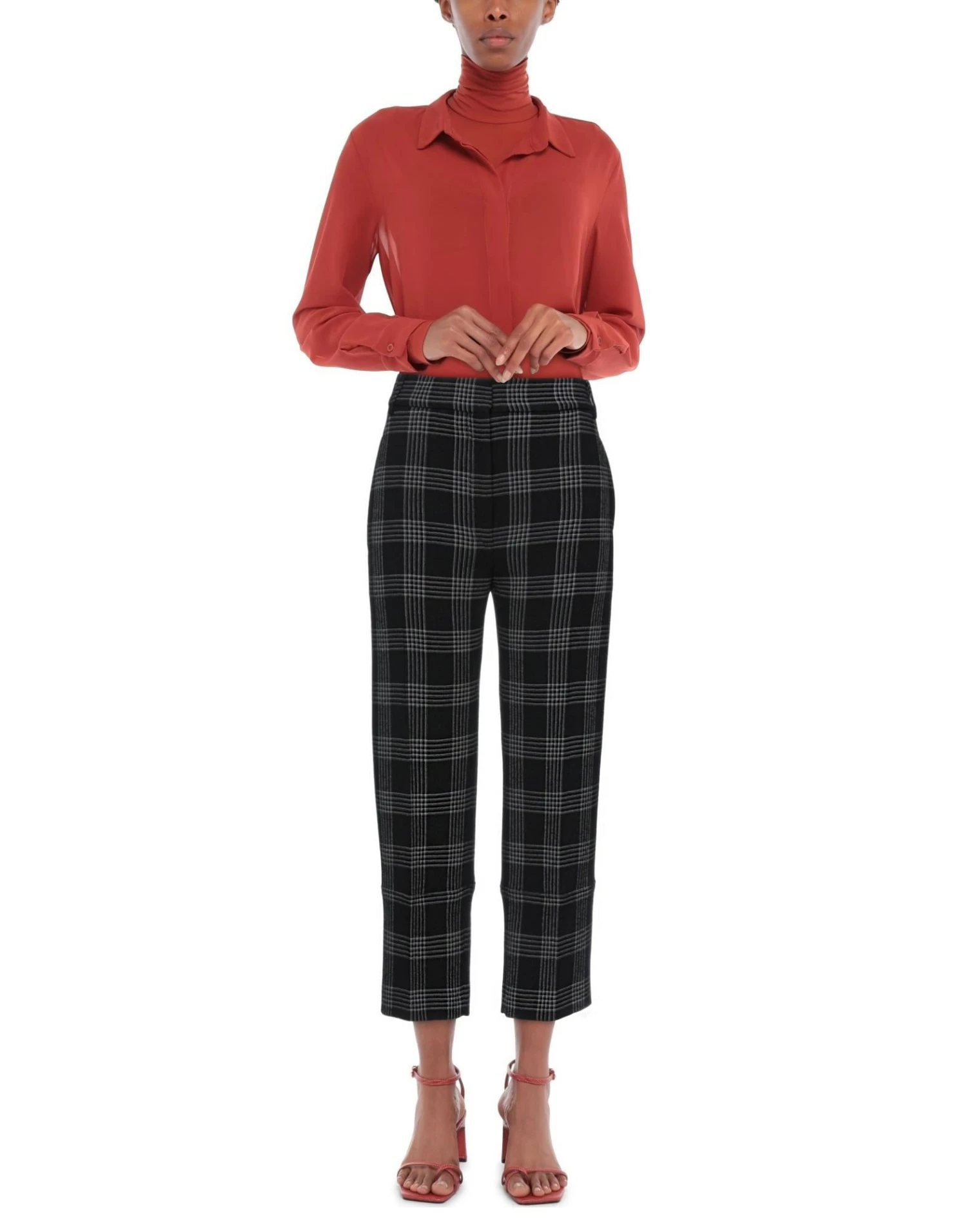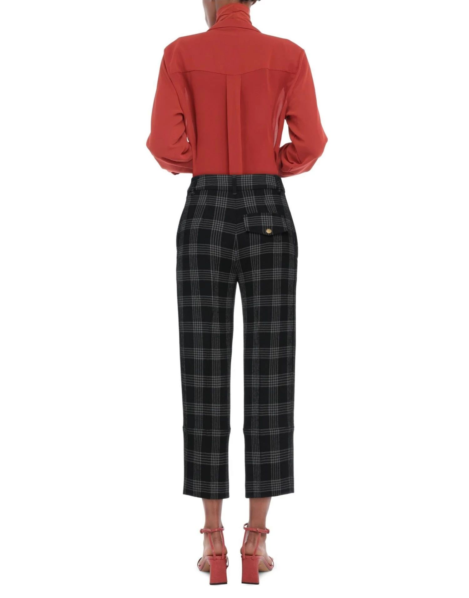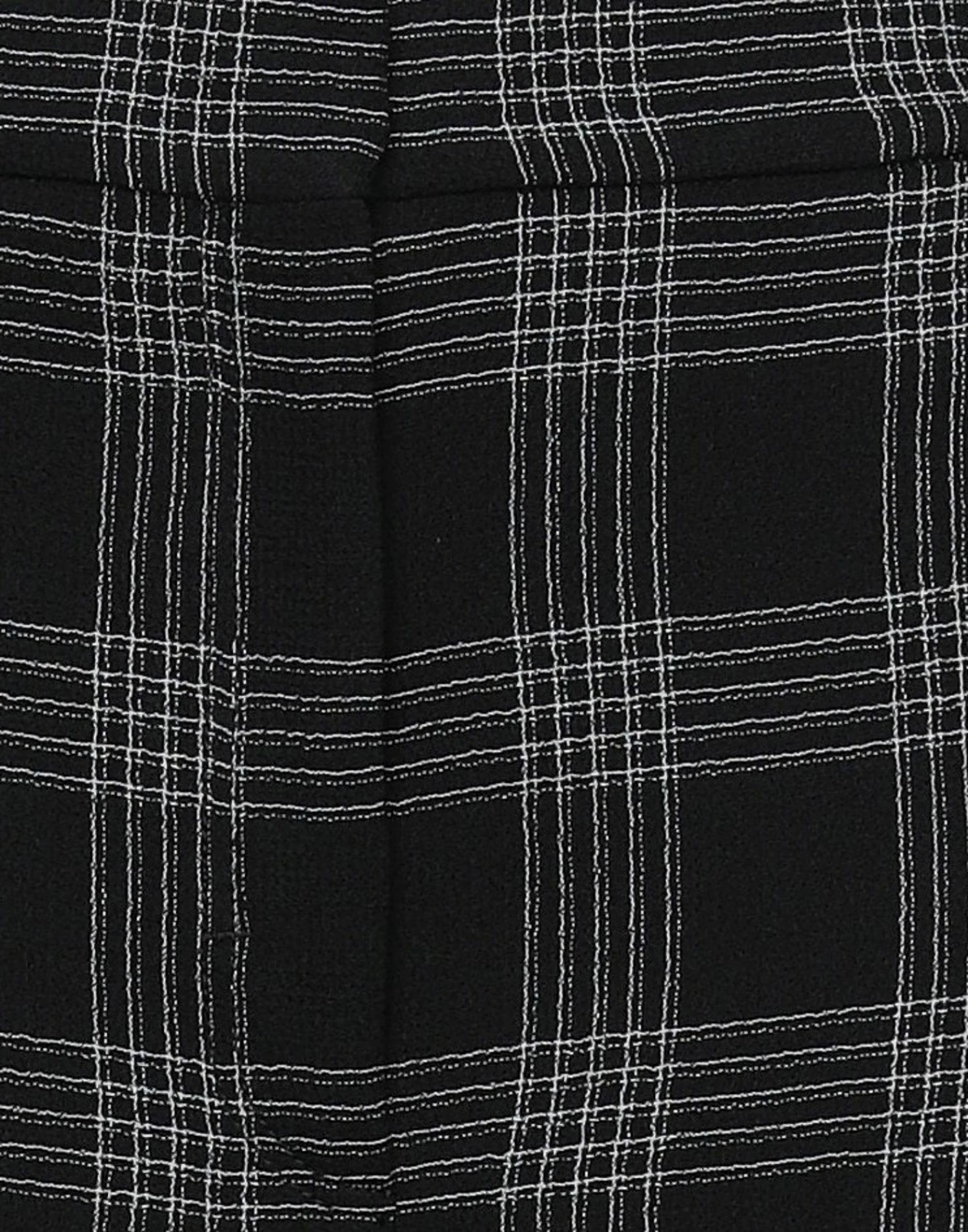 crepe, no appliqués, tartan pattern, high waisted, tapered leg, regular fit, hook-and-eye closure, zipper closure, multipockets