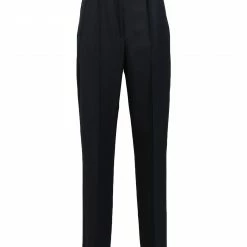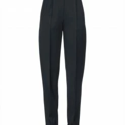 twill, no appliqués, solid color, high waisted, belt loops, tapered leg, regular fit, hook-and-eye closure, zipper closure, multipockets