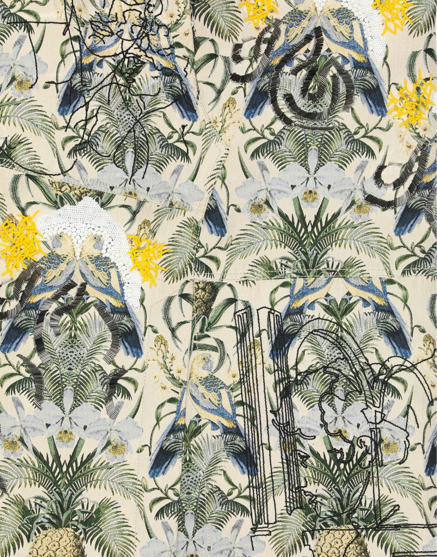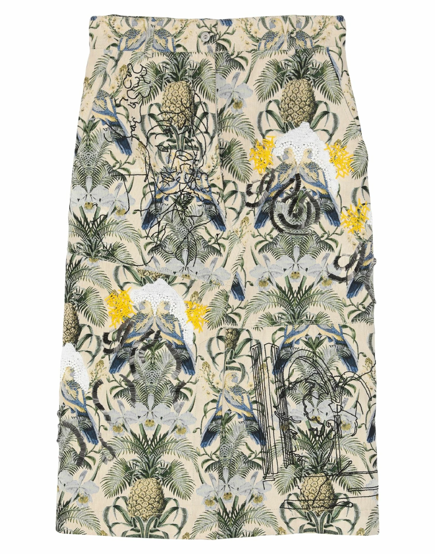 jacquard, plain weave, beads, embroidered detailing, hawaiian design, belt loops, zipper closure, 1 button, multipockets, divided skirt