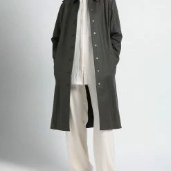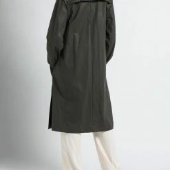 plain weave, coated effect, belt, solid color, classic neckline, single-breasted , long sleeves, unlined, snap buttons fastening, multipockets, large sized