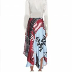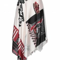 twill, satin finished, no appliqués, multicolor pattern, fully lined, zipper closure, hook-and-eye closure, no pockets