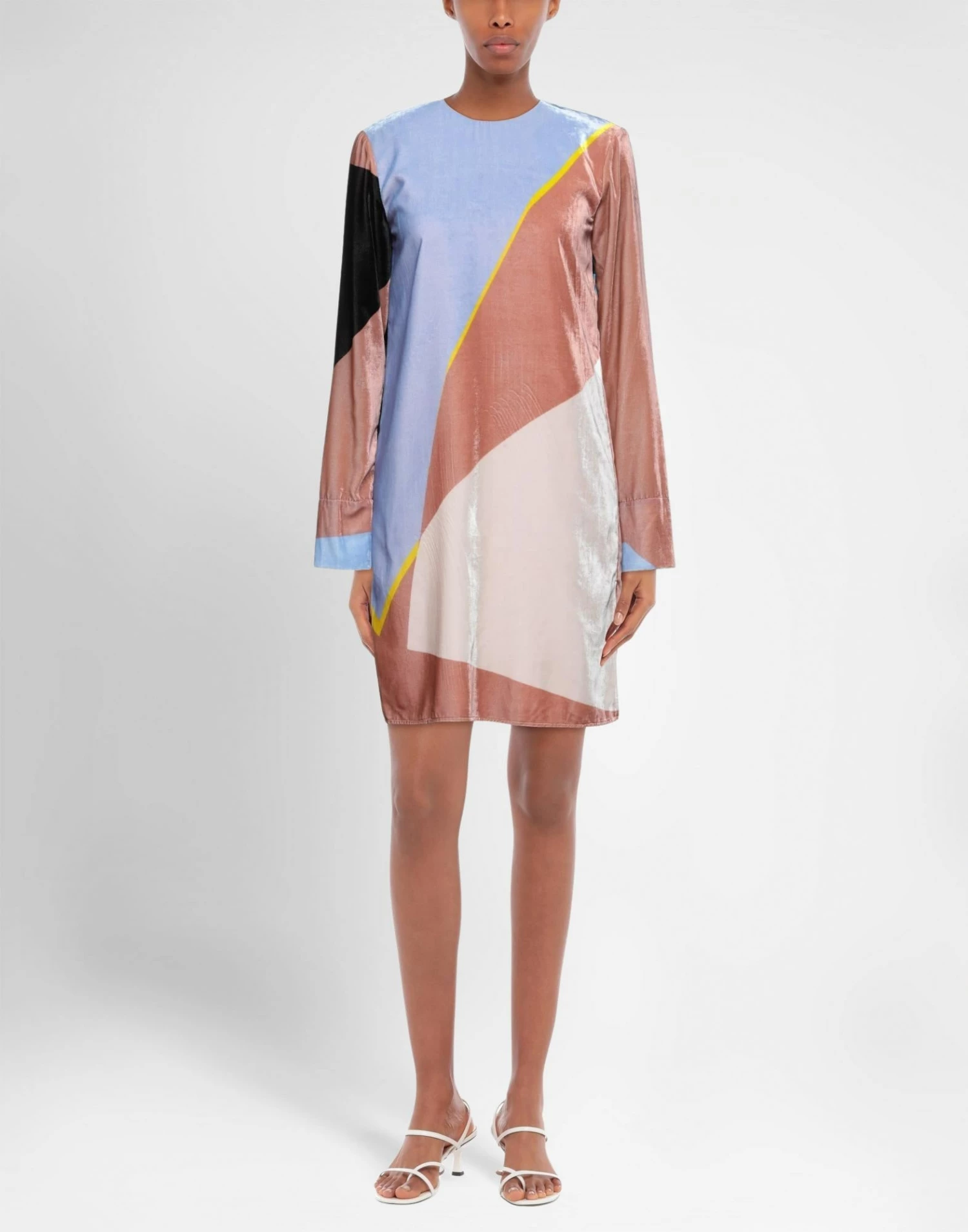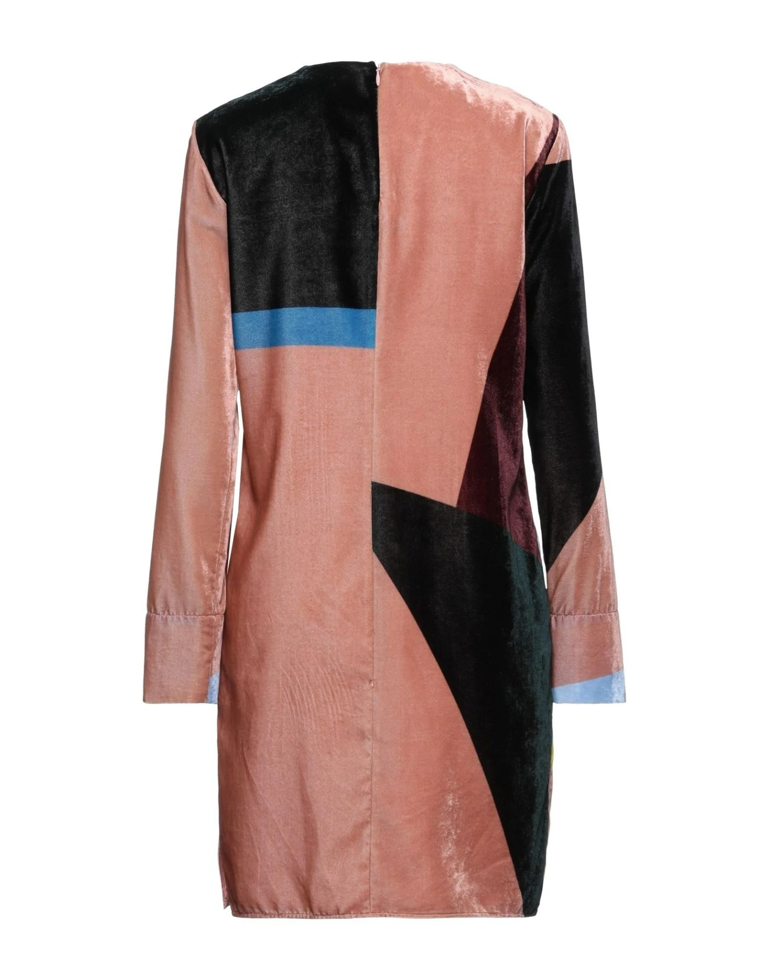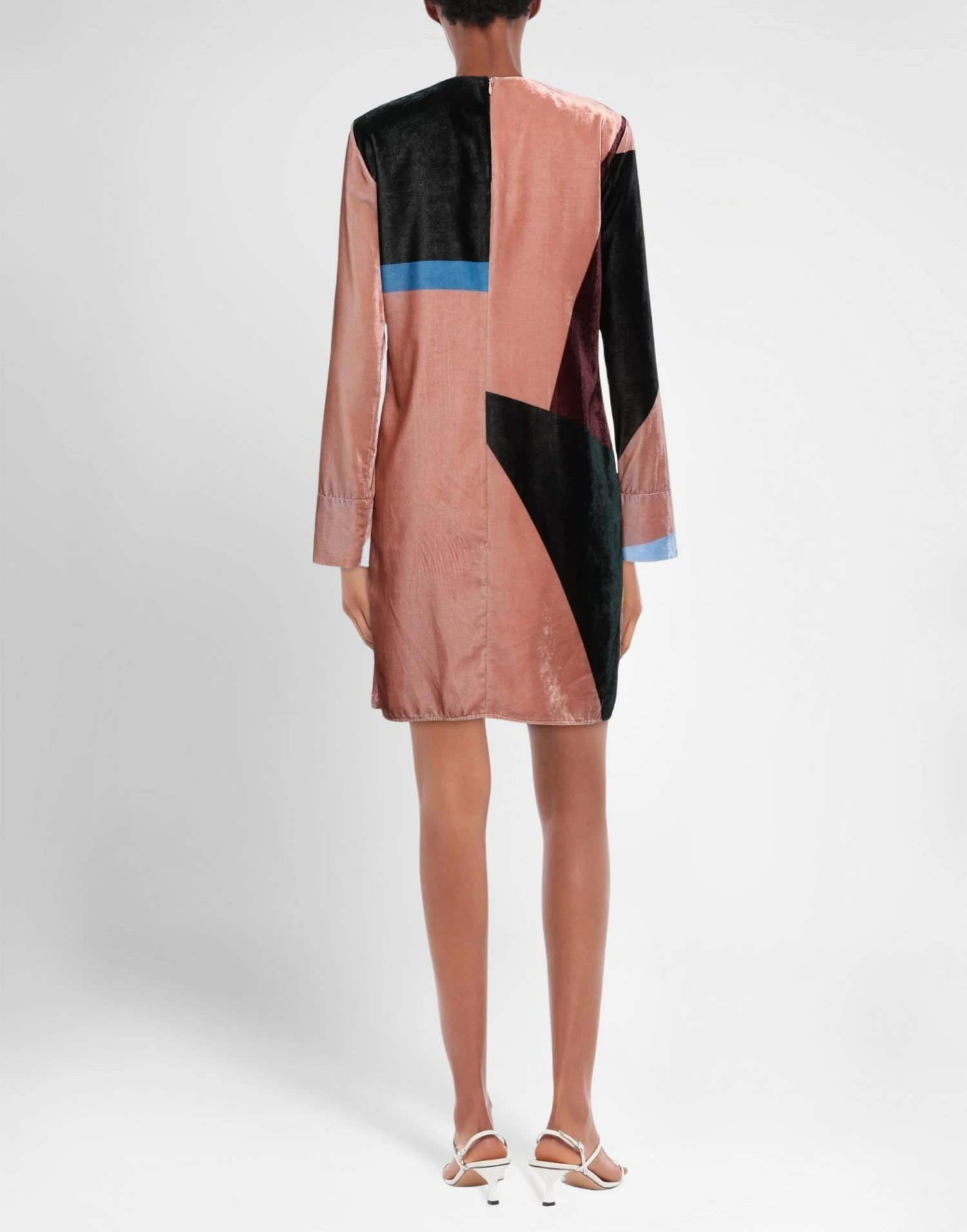 velvet, no appliqués, multicolor pattern, round collar, long sleeves, no pockets, rear closure, zip, fully lined, small sized