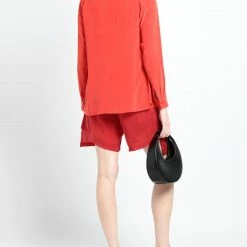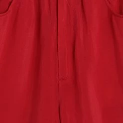 satin, brand logo, contrasting applications, solid color, high waisted, 1 button, zipper closure, multipockets
